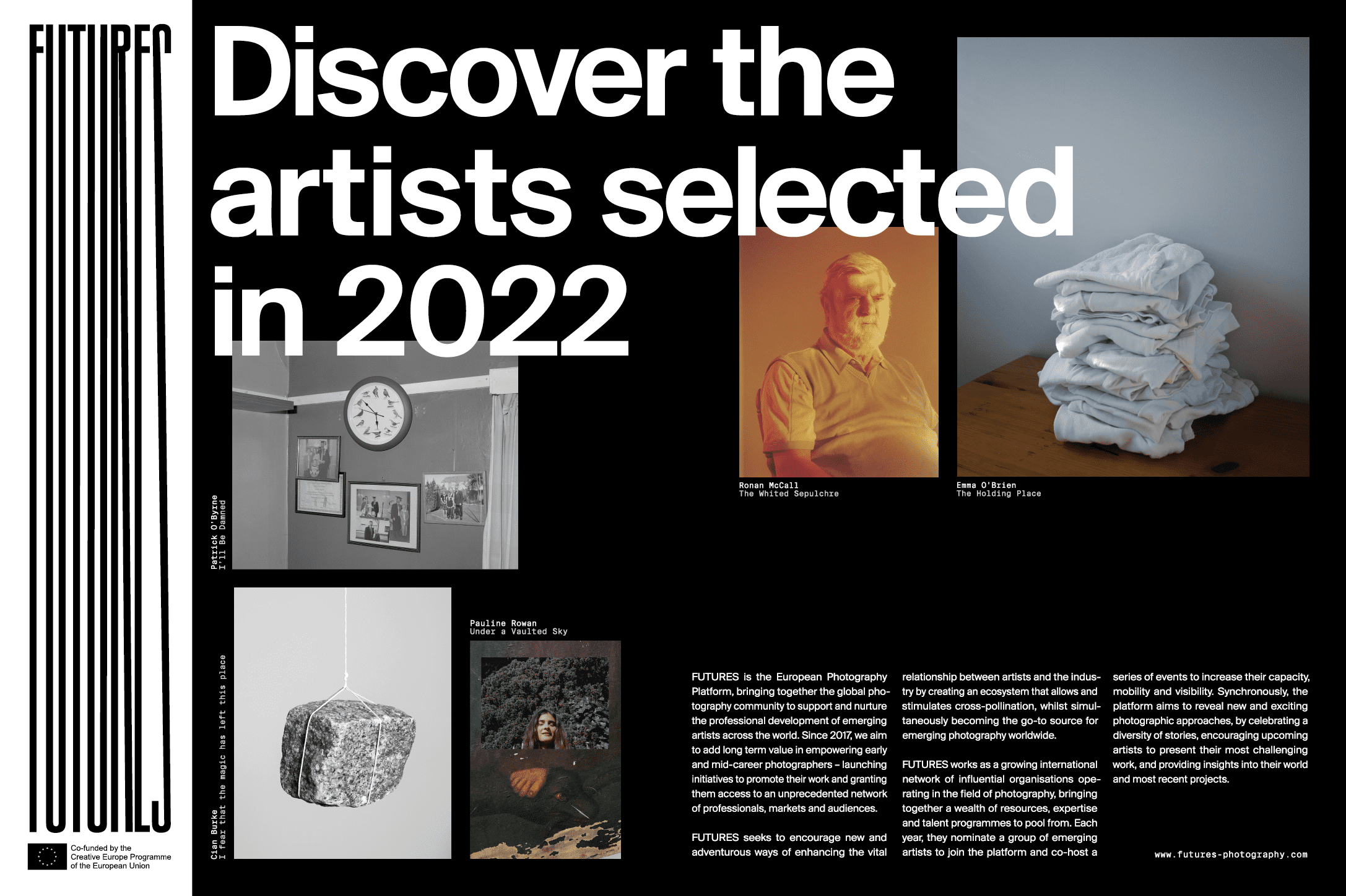 The current members of the platform are CAMERA (IT), Centre Photographique Rouen Normandie (FR), Ci.CLO (PT), Copenhagen Photo Festival (DK), Der Greif (DE), FOMU (BE), FOTODOK (NL), Fotogalleriet (NO), Fotofestiwal Lodz (PL), Fotograf 07 (CZ), ISSP (LV), Organ Vida (CR), PHotoESPAÑA (ES), PhotoIreland (IR), Photo Romania Festival (RO), Robert Capa Contemporary Photography Centre (HU), Triennial of Photography Hamburg (DE), and Void (GR). Futures is co-funded by the Creative Europe Programme of the European Union.